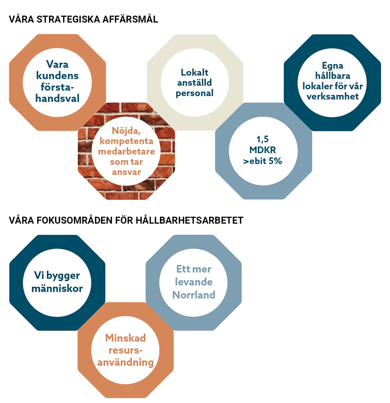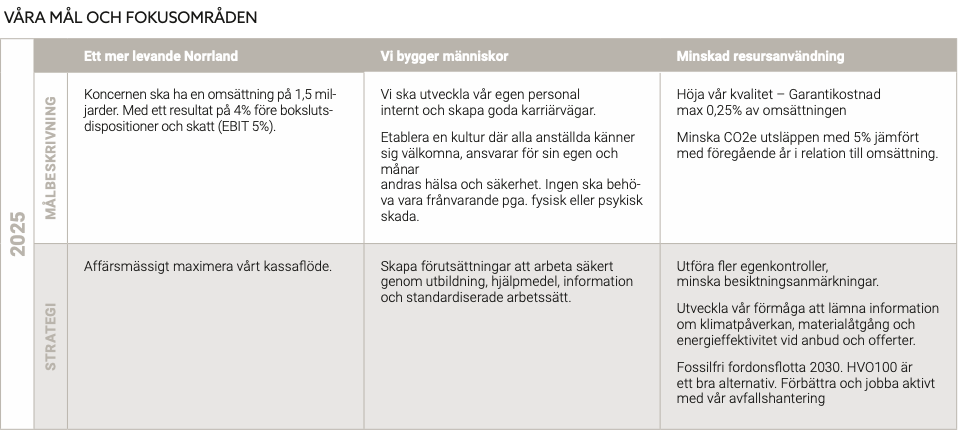 Vår verksamhet resulterar inte bara i det vi bygger, utan även den påverkan vi har på platsen där vi verkar och bor. De resurser vi använder förädlas i vår affär och vår verksamhet, vilket skapar ett värde för våra intressenter. I Contractors hållbarhetsmodell lyfter vi fram våra tre fokusområden som genomsyrar arbetet i hela verksamheten. Inom dessa områden tar vi avstamp mot bolagets hållbarhetsstrategi och hållbarhetsmål. Vi strävar efter att våra övergripande mål ska bidra till ett mer hållbart Norrland. Det är så vi kan skapa värden som består över tid.